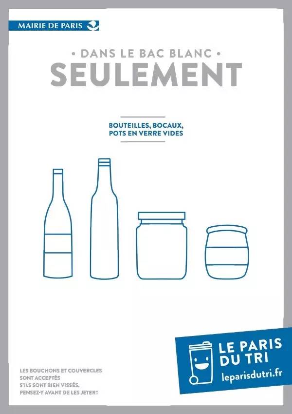 白色蓋子綠色箱體的垃圾箱是用來裝玻璃酒瓶、香水瓶、廣口瓶(bocaux)等玻璃制品的。