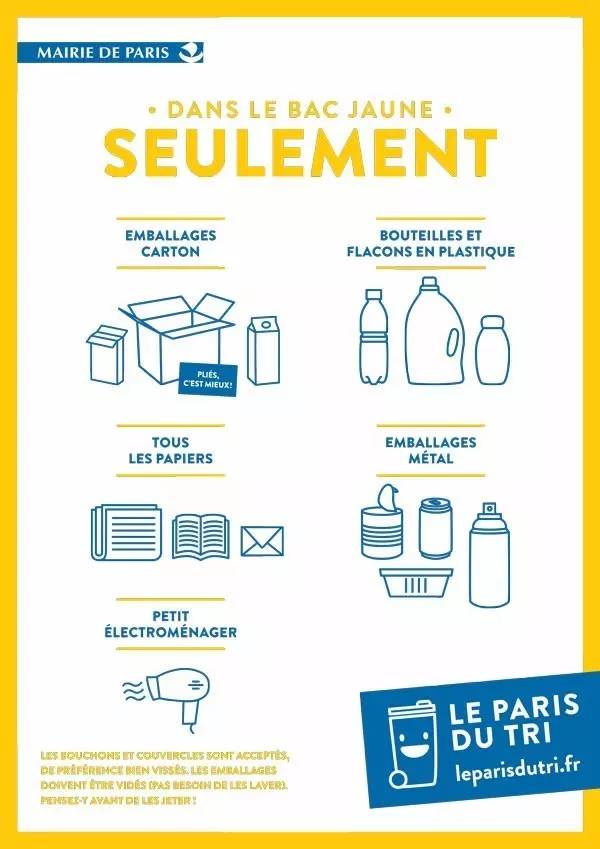 綠色箱體黃色蓋子的垃圾箱(vert à couvercle jaune)的垃圾箱用于裝紙板箱、紙、金屬、干凈的塑料和小型的電器。