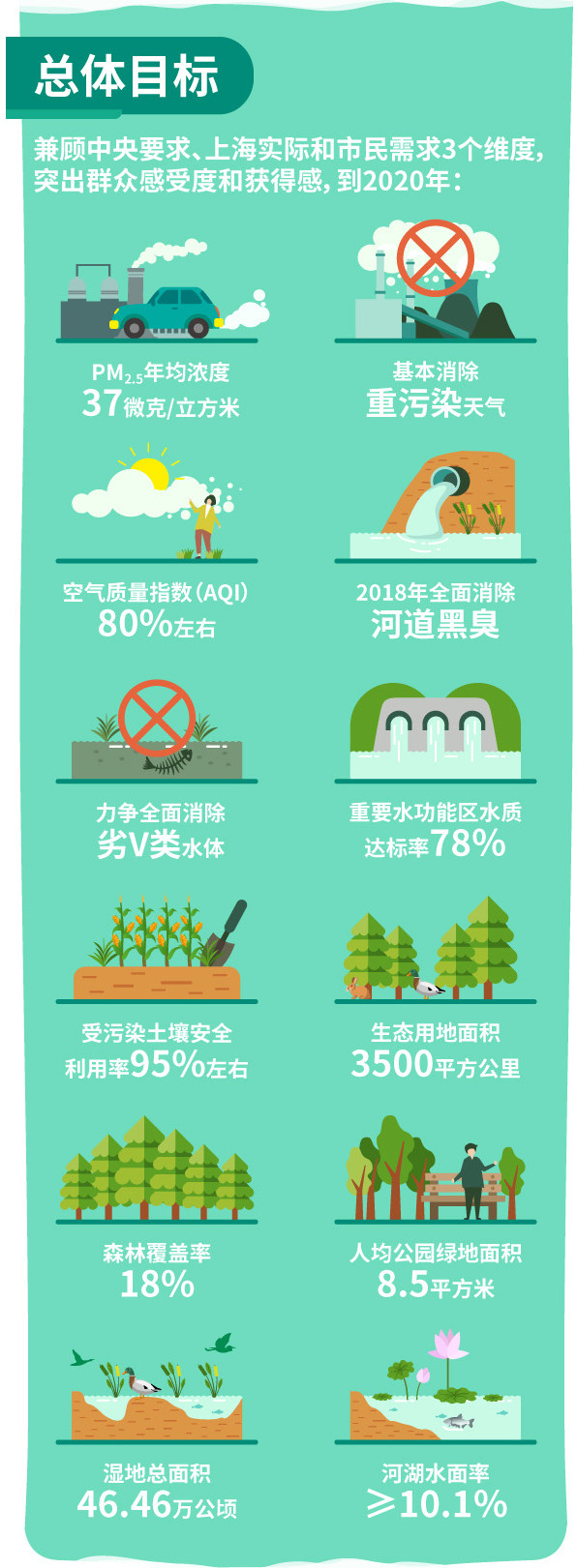 具體指標(biāo)上,到2020年,大氣方面,PM2.5年均濃度降到37微克/立方米,基本消除重污染天氣,環(huán)境空氣質(zhì)量?jī)?yōu)良率(AQI)達(dá)到80%左右;水方面,全面穩(wěn)定消除河道黑臭,力爭(zhēng)全面消除劣Ⅴ類水體;土壤方面,土壤環(huán)境質(zhì)量總體保持穩(wěn)定,受污染耕地及污染地塊安全利用率達(dá)到95%左右;生態(tài)方面,森林覆蓋率達(dá)到18%,人均公園綠地面積達(dá)到8.5平方米,濕地總面積維持在46.46萬(wàn)公頃,河湖水面率不低于10.1%。