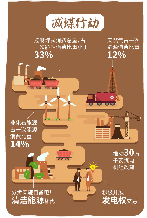 “減煤行動(dòng)”聚焦煤炭消費(fèi)總量控制,進(jìn)一步削減鋼鐵、石化行業(yè)用煤總量,控制發(fā)電行業(yè)煤炭總量,穩(wěn)定增加外來(lái)電供應(yīng)比例和非化石能源消費(fèi)比重。到2020年,煤炭消費(fèi)總量比2015年下降5%以上,煤炭占一次能源消費(fèi)比重下降到33%以下。