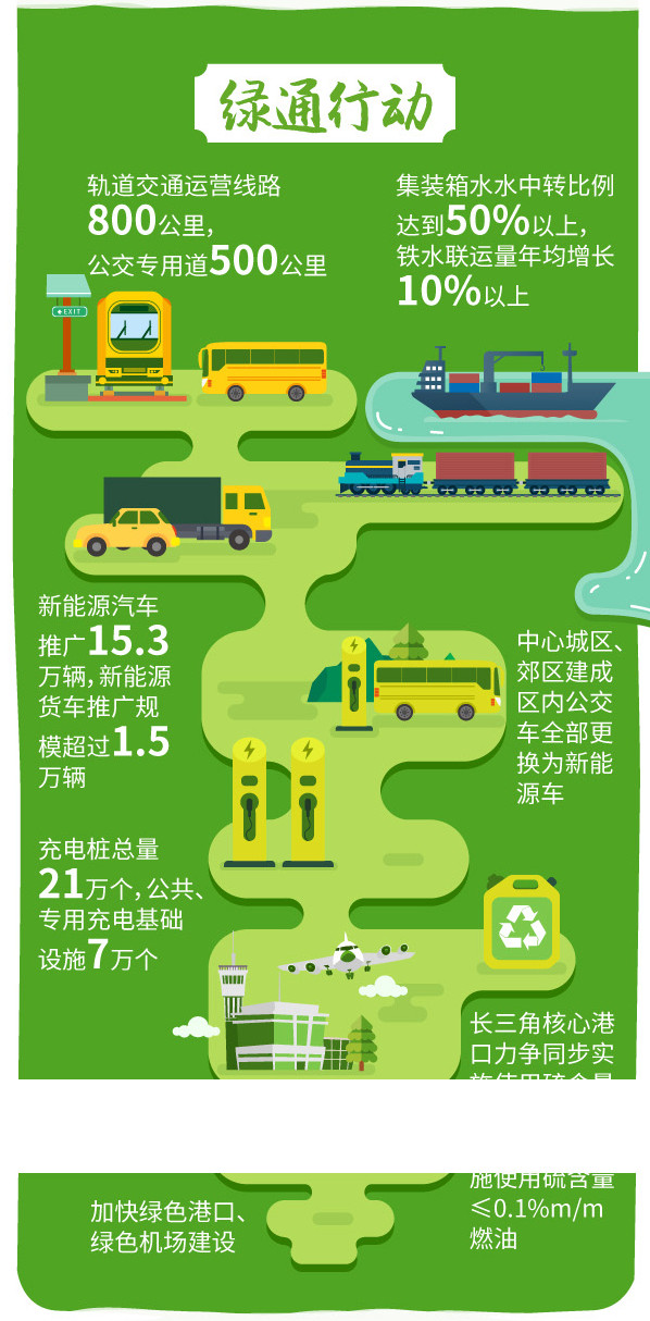 “綠通行動(dòng)”聚焦交通運(yùn)輸結(jié)構(gòu)調(diào)整,大力發(fā)展水中轉(zhuǎn)、水鐵聯(lián)運(yùn)等多式聯(lián)運(yùn),加大新能源汽車推廣,實(shí)施更嚴(yán)格船舶排放區(qū)控制,推進(jìn)綠色港口、機(jī)場(chǎng)建設(shè)等。到2020年,基本建成綠色高效交通運(yùn)輸體系。