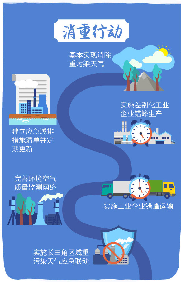 “消重行動(dòng)”聚焦重點(diǎn)時(shí)段(秋冬季)和重點(diǎn)領(lǐng)域(高污染重點(diǎn)行業(yè)),以減少重污染天氣為著力點(diǎn),科學(xué)預(yù)警、分級(jí)管控,合理實(shí)施差別化錯(cuò)峰生產(chǎn)和錯(cuò)峰運(yùn)輸,確保到2020年基本消除重污染天氣。