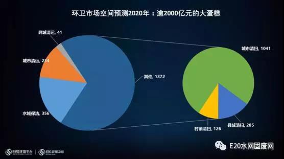 根據(jù)E20研究院的測算,我們認(rèn)為,到2020年,會有2000億的環(huán)衛(wèi)市場化空間。包括縣城清運41億、城市清運230億、水域保潔356億等。具體如下如所示。