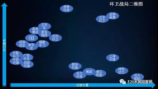 下圖進一步展示了環(huán)衛(wèi)服務(wù)和運營處置兩端的企業(yè)布局情況,縱軸是以人力密集型的環(huán)衛(wèi)服務(wù)業(yè)務(wù),而橫軸則是重資產(chǎn)模式的末端處置投資業(yè)務(wù)。從各企業(yè)的分布可以看到,目前兩大陣營分得較開,兩端歸類明顯,但是我相信再過三五年,這張圖中的兩類企業(yè)會向中分線更靠近一些。