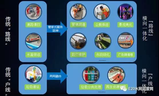 前面已經(jīng)說完三個戰(zhàn)略方向中的后向一體化,接下來探討下管家式服務(wù)及技術(shù)型增值。在管家式服務(wù)上,我們觀察到企業(yè)有兩個方式,第一,在“路線”上,從清掃馬路和水面保潔業(yè)務(wù)向服務(wù)區(qū)域的其他服務(wù)橫向延伸。第二,在“戶線”上,進行兩網(wǎng)融合和參與垃圾分類。僑銀在不少地方的“路線”服務(wù)中,基于政府的信任,已經(jīng)包攬了與道路物理接口緊密的綠化、管網(wǎng)井口疏通(本來是排水公司的服務(wù)范圍)、信號燈維護、路燈維護等各專業(yè)的服務(wù),是一個很代表性的現(xiàn)象。