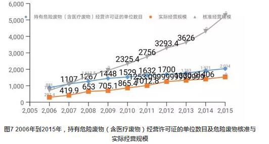 圖72006年到2015年,持有危險(xiǎn)廢物(含醫(yī)療廢物)經(jīng)營許可證的單位數(shù)目及危險(xiǎn)廢物核準(zhǔn)與實(shí)際經(jīng)營規(guī)模