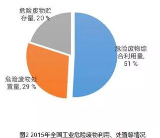 根據(jù)2016年中國統(tǒng)計(jì)年鑒,2015年全國工業(yè)危險(xiǎn)廢物產(chǎn)生量共3976.11萬噸,綜合利用量2049.72萬噸(包含了對往年貯存量的利用),處置量1173.98萬噸,貯存量810.30萬噸(如圖2)。