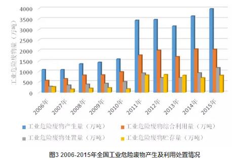 2006到2015年全國工業(yè)危險(xiǎn)廢物產(chǎn)生、綜合利用、處置與貯存情況見圖3。