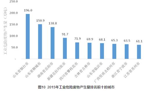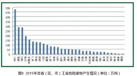 2015年各?。▍^(qū)、市)大、中城市發(fā)布的工業(yè)危險(xiǎn)廢物產(chǎn)生情況見圖9。工業(yè)危險(xiǎn)廢物產(chǎn)生量排在前三位的省份是山東、湖南、江蘇。