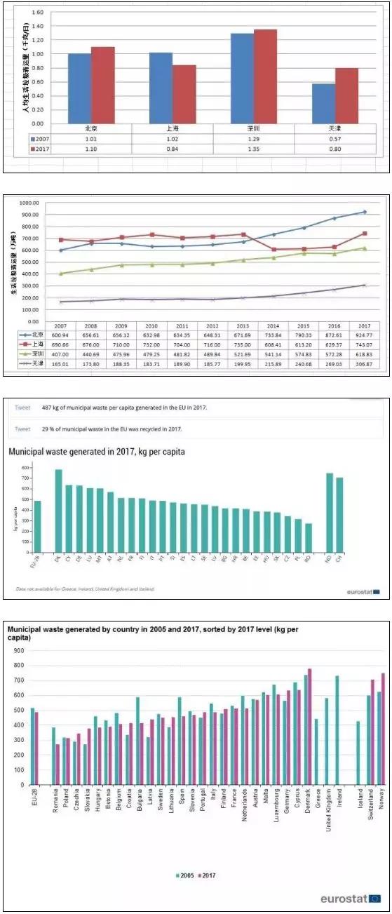 人均生活垃圾量是多是少,如何評價。有人說少好,少說明減量化做的好??礆W盟28個國家生活垃圾量統(tǒng)計,人均量多的國家往往生活垃圾管理水平高,生活垃圾回收利用利用率也高,如2017年歐洲生活垃圾量統(tǒng)計數(shù)據(jù):丹麥748千克/人·年,瑞士706千克/人·年,德國633千克/人·年;人均生活垃圾量少的國家往往經(jīng)濟水平低,生活垃圾回收率低,如羅馬尼亞272千克/人·年,塞爾維亞306千克/人·年;2017年瑞士生活垃圾回收利用率為53%,丹麥為48%,而羅馬尼亞只有13%。