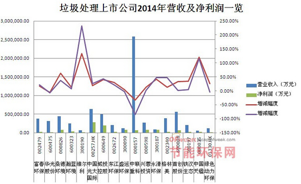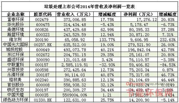 在一系列利好因素的影響下,眾多固廢公司實(shí)現(xiàn)上市意愿。截至目前為止,17家垃圾處理上市公司或者兼營垃圾處理業(yè)務(wù)的上市公司陸續(xù)公布了2014年度業(yè)績報(bào)告,其中業(yè)績增長的垃圾處理上市公司占比90%以上。其中營收增長的垃圾處理公司包括富春環(huán)保、桑德環(huán)境、瀚藍(lán)環(huán)境、中國光大國際、東江環(huán)保等15家企業(yè)??傮w來看,節(jié)能環(huán)保上市公司尤其是垃圾處理為主的上市公司在2014年迎來了行業(yè)發(fā)展的黃金時(shí)期,可謂“收獲頗豐”。