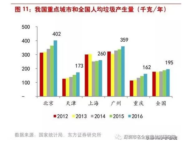 經(jīng)濟發(fā)展和城鎮(zhèn)化帶來的人均生活垃圾產(chǎn)量的不斷提高;根據(jù)國家統(tǒng)計局數(shù)據(jù),2016 年我國 人均垃圾產(chǎn)生量為 195 千克/年。我國幾個重點城市之間差別比較大,其中北京的人均垃圾產(chǎn) 生量最高,達到 402 千克/年,重慶的人均垃圾產(chǎn)生量最低,為 162 千克/年,經(jīng)濟較發(fā)達且城 鎮(zhèn)率高的城市人均垃圾產(chǎn)生量也較高。參考國外,美國的人均垃圾產(chǎn)生量為 657 千克/年,達 到我國平均的 3.3 倍。我們認為隨著我國經(jīng)濟的發(fā)展和城鎮(zhèn)化推進,人均垃圾產(chǎn)生量仍有較大的提升空間。