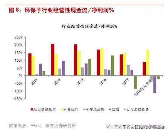 垃圾焚燒屬于資本較密集型,板塊的整體負債率維持在 55-60%的水平,與項目的杠桿率基本匹配; 垃圾處理收入和發(fā)電收入結(jié)算周期較短,經(jīng)營性現(xiàn)金流凈額和凈利潤的匹配度較高。2013-2018 年前三季度,垃圾焚燒板塊經(jīng)營性現(xiàn)金流/凈利潤%維持在 80-210%左右的水平,與水務(wù)運營板塊 相當,大幅好于水環(huán)境治理、監(jiān)測、大氣工程等環(huán)保子行業(yè)。