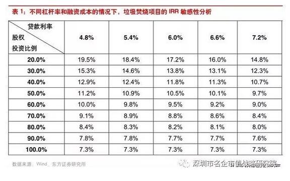 不同的股權(quán)投資比例和融資成本會顯著影響項目的收益率,當融資寬松時,融資比例上升,融資成 本下降,項目收益率上升;而在 2018 年去杠桿的背景下,項目的收益率也受到杠桿率下降和融資 成本上升的影響,但由于垃圾焚燒項目進入運營期后擁有穩(wěn)定的現(xiàn)金流,屬銀行等金融機構(gòu)優(yōu)先支 持項目,不存在融資難的問題。
