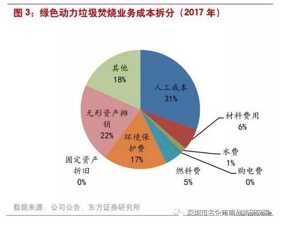 決定垃圾焚燒運營成本的主要因素包括:項目初始投資(決定折舊及攤銷),負債率及平均利率(決 定財務(wù)費用),環(huán)保排放標準(決定環(huán)境保護費、材料費等),根據(jù)部分公司披露的項目運營成本 分析,綠色動力垃圾焚燒業(yè)務(wù)的主要成本構(gòu)成為:人工成本(31%)、無形資產(chǎn)攤銷(22%)、環(huán) 境保護費(17%)等。中國天楹的主要成本構(gòu)成為:折舊及攤銷(37%)、原材料(24%)、人工(20%)。無形資產(chǎn)攤銷主要來自于垃圾焚燒項目投資,一般采取直線法進行攤銷。其他運營成本 包括檢修支出及檢測費用等。