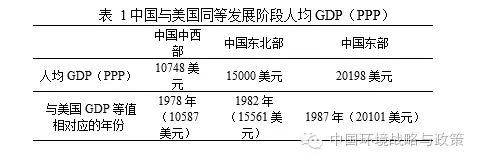 由于全球發(fā)展的大背景和人類認(rèn)識(shí)等發(fā)展階段不同,很難定量確定中國目前的發(fā)展階段相當(dāng)于美國的哪個(gè)階段。單單就同等的經(jīng)濟(jì)發(fā)展階段而言,其劃分可以參考錢納里(Chenery)、庫茲涅茲(Kuznets)、諾瑟姆(Northam)和霍夫曼(Hoffmann)等人提出的理論和標(biāo)準(zhǔn)。其中常用的標(biāo)準(zhǔn)為錢納里的人均GDP標(biāo)準(zhǔn)。但是,當(dāng)對(duì)兩國進(jìn)行比較時(shí),人均GDP沒有考慮實(shí)際價(jià)格水平。錢納里指出為真實(shí)反映各國經(jīng)濟(jì)狀況,采用購買力平價(jià)(PPP)的人均GDP進(jìn)行判定。由于中國的經(jīng)濟(jì)發(fā)展有明顯的地域不平衡性特點(diǎn)和現(xiàn)實(shí),單純用全國人均GDP(PPP)難以反映發(fā)展階段特征,故文采用國家統(tǒng)計(jì)局劃分的東部、中部、西部和東北四大地區(qū)的概念。