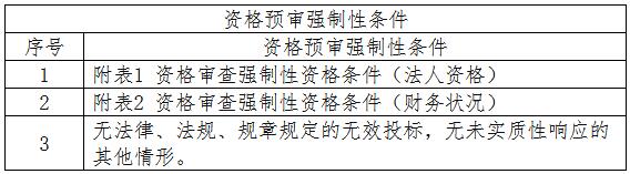 1、該項目資格預(yù)審小組應(yīng)按照資格預(yù)審強(qiáng)制性條件(詳見本項目資格預(yù)審文件“第四章資格預(yù)審強(qiáng)制性標(biāo)準(zhǔn)”)對申請人進(jìn)行資格預(yù)審,資格預(yù)審審查合格的申請人經(jīng)采購人確認(rèn)并發(fā)出采購邀請函后方可作為正式投標(biāo)邀請單位。