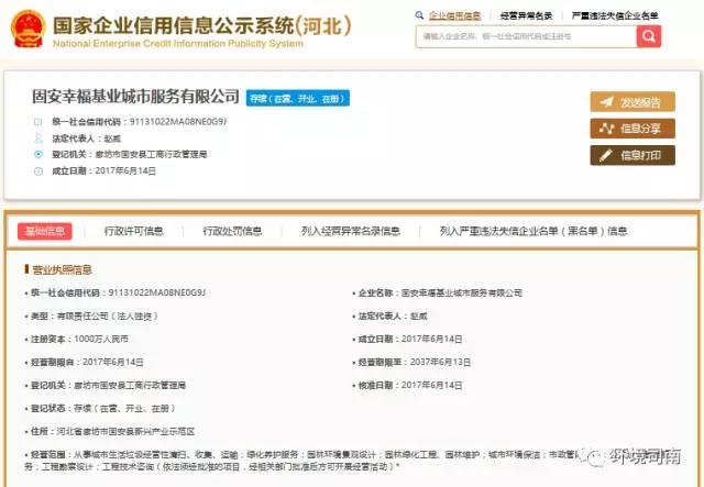 國家企業(yè)信用信息公示系統(tǒng)(河北)查詢顯示,華夏幸福于2017年6月14日注冊成立“固安幸?;鶚I(yè)城市服務(wù)有限公司”,經(jīng)營范圍涵蓋“城市生活垃圾經(jīng)營性清掃、收集、運(yùn)輸;綠化養(yǎng)護(hù)服務(wù);園林環(huán)境景觀設(shè)計(jì);園林綠化工程、園林維護(hù);城市環(huán)境保潔;市政管網(wǎng)設(shè)計(jì);公共設(shè)施管理服務(wù);工程勘察設(shè)計(jì);工程技術(shù)咨詢”等,主業(yè)直指環(huán)衛(wèi)服務(wù)領(lǐng)域。