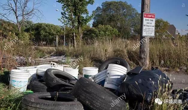 在底特律被隨意丟棄的廢舊輪胎和塑料桶等垃圾,而旁邊的標(biāo)示牌上展示的則是非法傾倒將會受到的處罰
