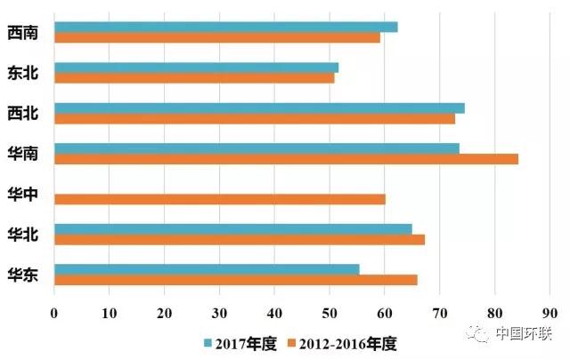 上圖是2012-2017生活垃圾焚燒價格補貼處理費熱力圖,處理費越高區(qū)域,顏色越深,整體來看,華東、華南處于深色區(qū)域。