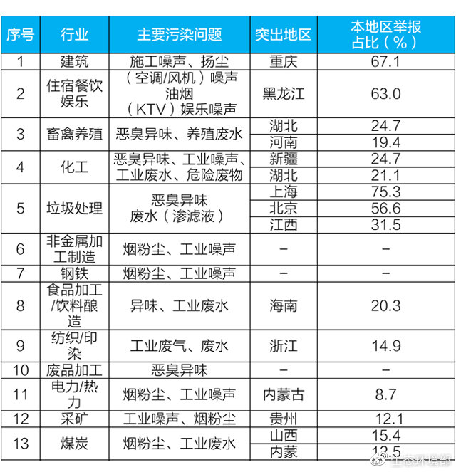 受產(chǎn)業(yè)結(jié)構(gòu)、管理水平等方面影響,各地主要舉報行業(yè)差異較大。其中,重慶建筑業(yè)、黑龍江住宿餐飲娛樂業(yè)、上海和北京垃圾處理業(yè)舉報占本?。ㄊ校┡e報量的一半以上,超過全國平均值一倍。湖北畜禽養(yǎng)殖業(yè)、新疆化工業(yè)、海南食品加工/飲料釀造業(yè)舉報超過全國平均值約15個百分點。此外,浙江紡織印染業(yè)、貴州采礦業(yè)、山西和內(nèi)蒙古煤炭業(yè)舉報也相對突出。