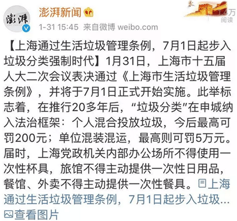 上海也將從2019年7月1日正式實(shí)施《生活垃圾管理?xiàng)l例》。