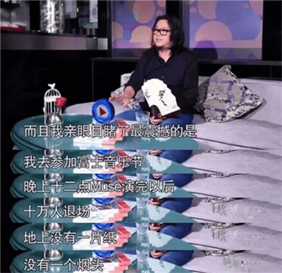 高曉松曾經(jīng)在節(jié)目中說到自己的親身經(jīng)歷,他坦言自己曾在東京參加富士音樂節(jié)(FUJI ROCK),結(jié)束時(shí)的會場令他十分震驚:10萬人離場后地上竟然沒有絲毫垃圾。而前來參加搖滾音樂節(jié)的這些標(biāo)榜自己“個(gè)性十足”的粉絲竟然在午夜排起長隊(duì)等候扔垃圾。