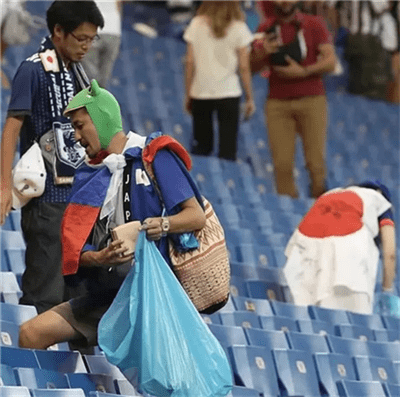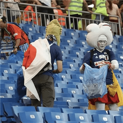 而我們也精彩在網(wǎng)上看到日本人撿垃圾的新聞,下圖就是日本球迷們在球賽散場后自發(fā)的撿垃圾。