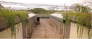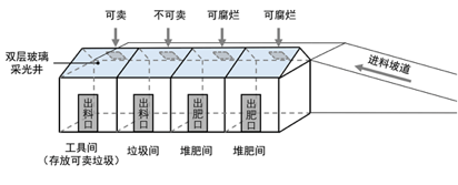 目前,可堆肥垃圾處置方式有兩種:陽(yáng)光堆肥發(fā)酵房和機(jī)械發(fā)酵堆肥站。根據(jù)實(shí)際情況金華市以前者為主。按照行政村人口和轉(zhuǎn)運(yùn)距離等因素,采取“一村一建”“多村合建”“村企聯(lián)建”等方式,建設(shè)“四格”式陽(yáng)光堆肥發(fā)酵房(如下圖所示),其中兩格堆肥,一用一備,另外兩格一格儲(chǔ)放可賣垃圾、一格儲(chǔ)放其他垃圾。所有陽(yáng)光堆肥發(fā)酵房實(shí)施標(biāo)準(zhǔn)化建設(shè),統(tǒng)一材料和外觀。