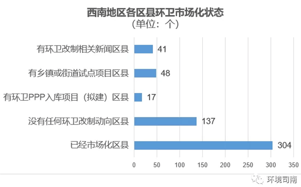 西南五省市區(qū)的512個(gè)區(qū)縣中,已經(jīng)實(shí)現(xiàn)環(huán)衛(wèi)市場(chǎng)化的區(qū)縣有304個(gè),有環(huán)衛(wèi)PPP入庫(kù)或擬建項(xiàng)目的區(qū)縣有17個(gè),有部分鄉(xiāng)鎮(zhèn)或街道試點(diǎn)項(xiàng)目的區(qū)縣有48個(gè),通過(guò)各種途徑發(fā)布環(huán)衛(wèi)改制新聞或信息的區(qū)縣有41,尚有137個(gè)區(qū)縣未發(fā)現(xiàn)任何環(huán)衛(wèi)試點(diǎn)項(xiàng)目或環(huán)衛(wèi)改制信息。
