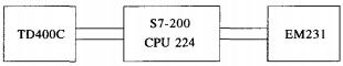 根據(jù)移動式垃圾壓縮站的工藝及控制要求,通過對I/O信號的分析,基本操作共需要13個輸入點,10個輸出點。采用SIEMENS公司的S7-200PLC,選擇CPU224,測量壓頭推進距離采用TURCK公司的直線位移傳感器,位移輸入信號為4~20mA,選擇SIEMENS公司的模擬量輸入模塊EM231,文本顯示器為SIEMENS公司的TD400C。控制系統(tǒng)的組成如圖2所示。