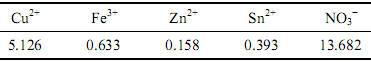 用破碎機將廢線路板碎成小片(10mm×20mm×2mm),加入一定量的硝酸浸出,過濾得浸出液,其主要成分列于表1。用稀HNO3和稀NaOH調(diào)節(jié)原料液pH值,用NaNO3、Na2SO4和NaCl調(diào)節(jié)料液中NO3?、SO42?和Cl?的濃度。
