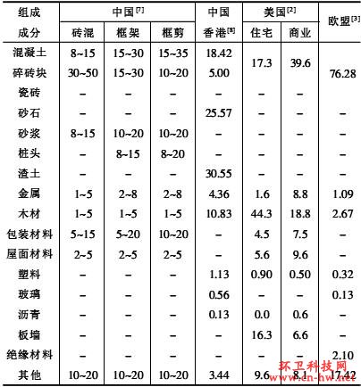 建筑垃圾的成分和含量隨著建筑結(jié)構(gòu)的類型、建筑物的用途、施工技術(shù)及所采用的材料等的不同而存在一定的差異。如表1所示,各國和地區(qū)的建設(shè)施工產(chǎn)生建筑垃圾成分和比例有較大的不同,如香港地區(qū)包括了渣土,歐盟各國則包括了絕緣材料,美國廣泛使用板墻等。但是也有一些共同之處,如大部分國家和地區(qū)的建筑垃圾中,惰性部分如混凝土、磚、碎石、陶瓷等占的比例較大(在美國,住宅建設(shè)所產(chǎn)生的建筑垃圾中廢木材占很大的比例,這主要是由于美國的住宅普遍是木結(jié)構(gòu)的單棟房屋)。我國的資料還顯示,建筑結(jié)構(gòu)形式對建筑垃圾各成分比例有明顯的影響。