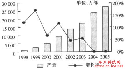 1998年至2002年,我國累計(jì)生產(chǎn)手機(jī)2.7億部,2003年手機(jī)產(chǎn)量約1.56億部,按每部手機(jī)配1.8塊電池計(jì)算,2003年國內(nèi)手機(jī)配套鋰電池量為3.06億塊。我國移動(dòng)電話用戶數(shù)從1995年的360萬增至2001年的14480萬戶。2004年我國1G+2G移動(dòng)用戶達(dá)2.8億個(gè),CDMA類達(dá)到1600萬戶,到2005年底我國移動(dòng)用戶量達(dá)到3.2億個(gè),按老手機(jī)50%的電池更換量計(jì)算,2005年國內(nèi)屆時(shí)手機(jī)電池更換量為1.2億只。如圖1所示[1]。