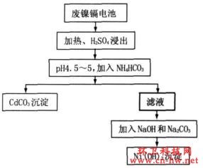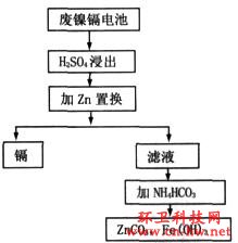 該方法采用將Cd2+變成Cd(OH)2沉淀析出,來(lái)實(shí)現(xiàn)Cd2+、Ni2+分離,但要使Cd(OH)2析出的前提是Ni(OH)2析出,因此在Cd(OH)2析出之前,加入碳酸鹽,使其形成CdCO3析出。然后用NH4HCO3沉淀析出CdCO3,這里應(yīng)注意溶液的pH值,在前一步析出Cd(OH)2時(shí),pH為1~2,后一步加NH4HCO3時(shí)pH為7左右,可采用稀釋法,而稀釋后Cd2+、Ni2+濃度也降低了,浸出液體積成倍增長(zhǎng),因此浸出液將對(duì)環(huán)境造成影響。