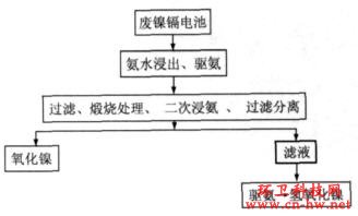 該方法采用氨水作浸出劑,主要考慮浸出液不需進(jìn)行中和處理,不必采用萃取劑萃取分離,NH3易進(jìn)行回收處理,廢水可循環(huán)利用等特點(diǎn)。孔祥華試驗(yàn)結(jié)果表明,在NH3的濃度足夠高的情況下,Ni(OH)2、Cd(OH)2均可與氨水反應(yīng),迅速溶于氨水;而經(jīng)500℃烘烤后所得NiO與CdO卻不同,NiO幾乎不溶于氨水,而在合適的pH值及NH3的濃度足夠高的條件下,CdO迅速溶解。Ni、Cd的浸出率分別達(dá)99.6%、98.5%。鎘鎳電池回收產(chǎn)品的純度相當(dāng)高,NiO為99.6%,Cd(OH)2為99.97%,具體流程如圖2。