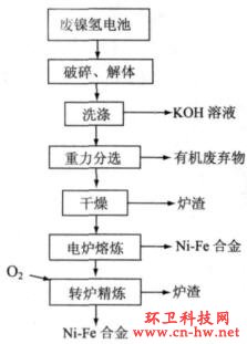 美國(guó)TWCA公司[23]進(jìn)行了再生利用MH-Ni蓄電池的試驗(yàn)研究,將廢的MH-Ni蓄電池通過(guò)機(jī)械粉碎→清洗→分離有機(jī)物→干燥→重熔和適當(dāng)?shù)暮辖鸹幚砗?,可以中間合金形式回收電池中的大部分Ni、Co等有價(jià)金屬,所得中間合金可分別用于鑄鐵生產(chǎn)的合金化,以及某些鎳基合金和合金鋼生產(chǎn)的原材料等。