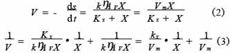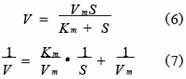 由圖5可見,堆肥反應(yīng)速率隨底物濃度的增加,逐漸趨于一個定值,即最大堆肥反應(yīng)速率。假設(shè)這種降解反應(yīng)速率符合莫諾特(Monod)動力學(xué)模型,該模型對底物濃度來說其數(shù)學(xué)公式為式(6)和式(7)。