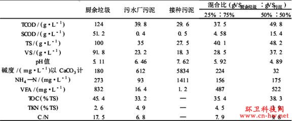 厭氧消化是污泥處理常用的減容穩(wěn)定工藝,而目前我國污水廠中投入運行的消化池容積利用率很低,揮發(fā)性固體(VS)去除率和產(chǎn)氣量也不高。隨著廚余垃圾在城市垃圾中的比重不斷上升,由于其含水率和有機成分都很高,因此很適合采用厭氧消化工藝進行處理,將廚余垃圾運送到城市污水處理廠,利用現(xiàn)有的污泥消化池處理廚余垃圾,而不需要很多的額外的投資,又解決了廚余垃圾的污染問題。將廚余垃圾和污水污泥混合消化能夠提高物料的固體含量從而充分提高消化池的利用效率,有助于促進物料的營養(yǎng)平衡,提高產(chǎn)氣量以及降解能力[1]。