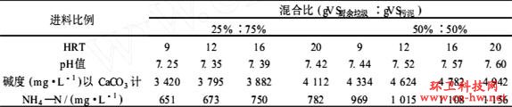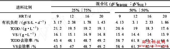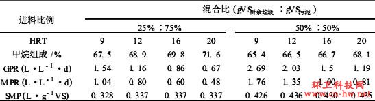 本實驗的主要研究目標是對廚余垃圾和污水廠污泥混合消化的可行性進行評價,對污泥和垃圾在不同比例進料以及不同的HRT對混合物料厭氧消化過程的穩(wěn)定性和處理效果的影響進行了研究。