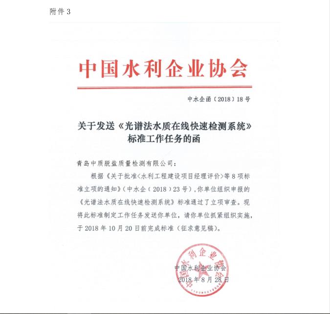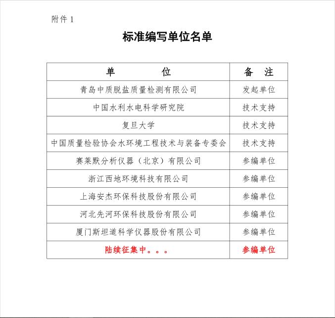 根據(jù)《關(guān)于批準(zhǔn)<水利工程建設(shè)項(xiàng)目經(jīng)理評(píng)價(jià)>等8項(xiàng)標(biāo)準(zhǔn)立項(xiàng)的通知》(中水企〔2018〕23號(hào)),由青島中質(zhì)脫鹽質(zhì)量檢測(cè)有限公司發(fā)起立項(xiàng)的《光譜法水質(zhì)在線快速檢測(cè)系統(tǒng)》標(biāo)準(zhǔn),經(jīng)中國水利企業(yè)協(xié)會(huì)審查批準(zhǔn)立項(xiàng),我公司組織開展標(biāo)準(zhǔn)編制工作。為研究討論標(biāo)準(zhǔn)技術(shù)問題,確保標(biāo)準(zhǔn)編寫質(zhì)量,定于2019年1月11日在上海召開標(biāo)準(zhǔn)討論會(huì),請(qǐng)貴單位選派參與標(biāo)準(zhǔn)編寫的專家參加?,F(xiàn)將相關(guān)事宜通知如下:
