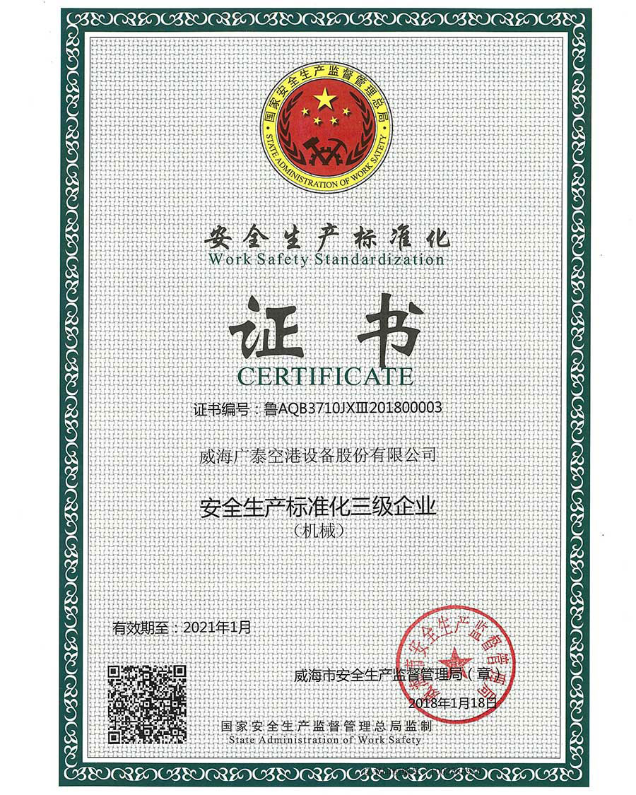 威海廣泰于2007年1月在深圳證券交易所上市,公司現(xiàn)已通過質(zhì)量體系認證、環(huán)境體系認證等,是國家創(chuàng)新型企業(yè)、國家技術(shù)創(chuàng)新示范企業(yè)、商務(wù)部認定對外援助物資項目總承包企業(yè),擁有“國家認定企業(yè)技術(shù)中心”、“國家空港地面設(shè)備工程技術(shù)研究中心”及“國家地方聯(lián)合工程實驗室”,設(shè)立博士后科研工作站。截止目前,公司已獲得577項技術(shù)專利,其中75項發(fā)明專利、2項美國專利、1項歐洲專利,擁有國家級重點新產(chǎn)品16項,取得國家和省部級科技進步獎43個。公司注冊資本3.8億元,總資產(chǎn)44.8億元。