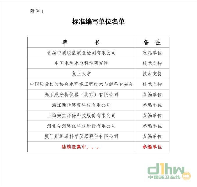 根據(jù)《關(guān)于批準<水利工程建設(shè)項目經(jīng)理評價>等8項標準立項的通知》(中水企〔2018〕23號),由青島中質(zhì)脫鹽質(zhì)量檢測有限公司發(fā)起立項的《光譜法水質(zhì)在線快速檢測系統(tǒng)》標準,經(jīng)中國水利企業(yè)協(xié)會審查批準立項,我公司組織開展標準編制工作。為研究討論標準技術(shù)問題,確保標準編寫質(zhì)量,定于2019年1月11日在上海召開標準討論會,請貴單位選派參與標準編寫的專家參加?,F(xiàn)將相關(guān)事宜通知如下:一、會議時間2019年1月11日9:00-12:00開會(1月10日下午13:00-19:00報到)。二、參會人員主編單位和參編單位的標準編制相關(guān)負責人。三、會議內(nèi)容(一)起草單位對標準編制情況進行匯報;(二)對標準初稿進行研究和討論;(三)提出下一步編制工作計劃和安排。四、會議地點上海江蘇飯店(地址:上海市武寧路888號,電話:021-62051888)五、注意事項(一) 為了便于標準編制工作開展和組織,請相關(guān)參編單位積極配合,提供相關(guān)人力、物力及資金支持,相關(guān)事宜請與我公司聯(lián)系。(二)食宿由組委會統(tǒng)一安排,住宿費用
