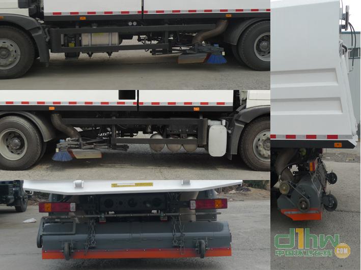 該車主要用于城市道路、廣場以及公園路面清掃;由封閉式車箱,風機、掃刷、吸盤等組成;側面防護裝置由工作裝置及部分護欄組成,側面防護裝置材料材質為Q235B,與車架采用螺栓連接,后部工作裝置與后下部防護裝置相干涉,故豁免,后部工作裝置行車時離地高:270mm;隨底盤裝配ABS,ABS型號: 4460046300,ABS生產(chǎn)廠家: 威伯科汽車控制系統(tǒng)(中國)有限公司。
