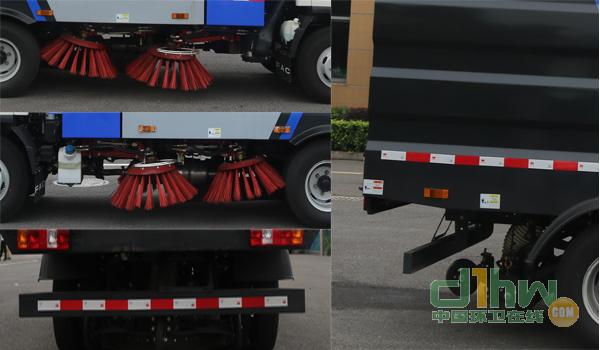 前懸/軸距/后懸對應(yīng)關(guān)系:1140/3360/1655,1110/3308/1737,車輛兩側(cè)安裝有專用清掃裝置,故側(cè)面防護應(yīng)豁免,后防護與車輛螺栓連接,后防護斷面尺寸(mm):120×50,后防護離地高度為410毫米,材料采用Q235A,該車帶OBD。ABS控制器型號/廠家:ABS 8/克諾爾制動設(shè)備(上海)有限公司;VIE ABS-Ⅱ/浙江萬安科技股份有限公司,專用裝置由垃圾箱、副發(fā)及風(fēng)機和掃刷組成,主要將清掃垃圾吸入垃圾箱內(nèi),達到清潔路面的目的。