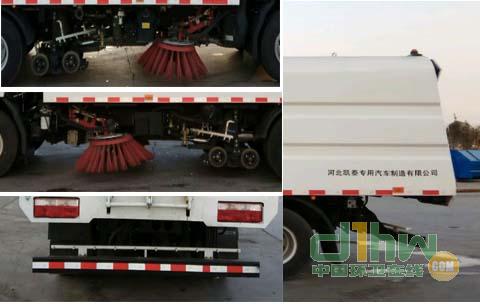 該車僅選用3815軸距.該車用途為;路面清掃.專用裝置名稱;液壓油缸,液壓馬達(dá),風(fēng)機(jī),吸盤,液壓閥,ABS系統(tǒng)控制器型號(hào):CM4XL-4S/4K (4S/4M),ABS系統(tǒng)控制器生產(chǎn)廠家:廣州市科密汽車制動(dòng)技術(shù)開(kāi)發(fā)有限公司;后防護(hù)裝置的材料為Q235,連接方式為螺栓連接,截面尺寸120×60(mm),后防護(hù)離地高度為400mm;側(cè)面防護(hù)與專用裝置相干涉故豁免,選裝駕駛室。