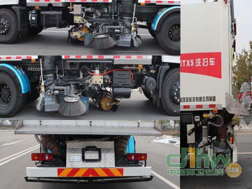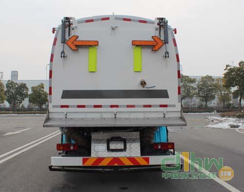 前霧燈、頂部裝飾燈為選裝件,選裝臥鋪側(cè)窗裝飾板,該車采用5000mm軸距底盤.側(cè)防護裝置與工作裝置干涉,豁免;后部防護裝置材料為Q235A,連接方式為螺栓聯(lián)接,斷面尺寸為150×100mm,離地高度為440mm. ABS型號:3631010-C2000,4460046440生產(chǎn)廠家:東科克諾爾商用車制動系統(tǒng)(十堰)有限公司,威伯科汽車控制系統(tǒng)(中國)有限公司,該車主要裝備有垃圾箱,水箱,風機抽吸系統(tǒng),洗掃刷等專用裝置,具有清掃和清洗路面,街道等場地的功能.選裝另一種洗掃機構(gòu)(吸口前置,去掉滾掃和兩側(cè)各一個掃盤)。