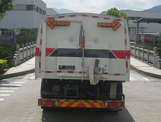 僅選用5000mm軸距;專用裝置代替?zhèn)确雷o(hù);后部防護(hù)裝置的材料材質(zhì):Q235A;聯(lián)接方式:螺栓聯(lián)接;后部防護(hù)裝置的斷面尺寸(寬×高)mm:60×200;后部防護(hù)裝置離地高:490mm;ABS型號:ABS 8;生產(chǎn)廠家:東科克諾爾商用車制動系統(tǒng)(十堰)有限公司。該車通過清掃裝置,采用吸掃結(jié)合,濕式除塵的工作原理對路面進(jìn)行清掃作業(yè)