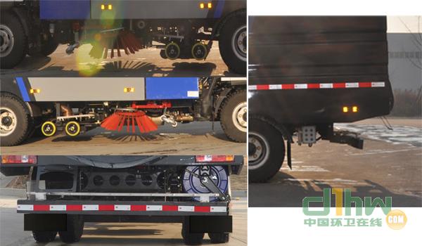 車輛兩側(cè)安裝有專用清掃裝置,故側(cè)面防護應(yīng)豁免,后防護與車輛螺栓連接,后防護斷面尺寸(mm):120×50,后防護離地高度為440毫米,材料采用Q235,僅采用軸距為3845mm的底盤改裝。ABS控制器型號/廠家:VIE ABS-Ⅱ/浙江萬安科技股份有限公司,專用裝置由垃圾箱、水箱、副發(fā)及風(fēng)機和掃刷組成,主要將清掃垃圾吸入垃圾箱內(nèi),達(dá)到清潔路面的目的。