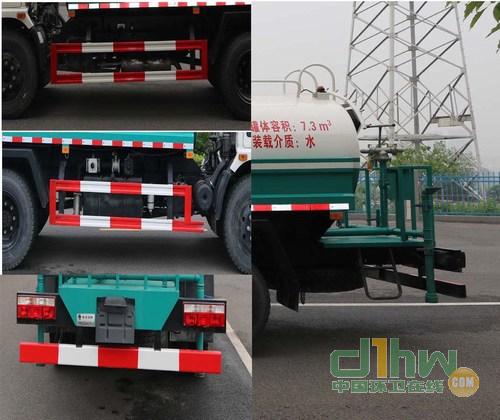 該車裝備罐體,噴灑系統(tǒng),主要用于道路,廠區(qū)(場區(qū))灑水,起除塵和降溫作用;罐體有效容積為7.3立方米;罐體外形尺寸(長×長軸×短軸)(毫米)為4200×2000×1300;防護材料均為 Q235,側(cè)防護為螺栓連接,后下部防護為焊接連接,斷面尺寸為120毫米×50毫米,離地高為500毫米;ABS系統(tǒng)生產(chǎn)廠家/型號:襄陽東風隆誠機械有限責任公司,ABS/ASR-24V-4S/4M;僅用8.25R20 14PR,245/70R19.5 16PR輪胎.